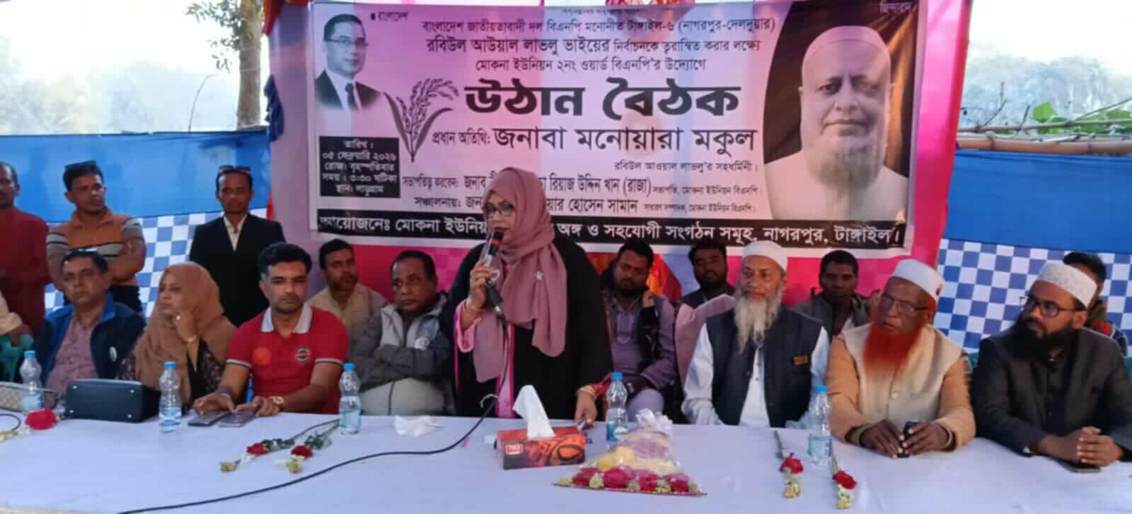 নিজ্বস্ব প্রতিনিধিঃ ত্রেয়োদশ জাতীয় সংসদ নির্বাচনে টাঙ্গাইল ৬ (নাগরপুর-দেলদুয়ার) আসনে বিএনপির মনোনীত প্রার্থী রবিউল আওয়াল লাভলুর নির্বাচনকে ত্বরান্বিত করার পক্ষে মোকনা ইউনিয়নের ২ নং ওয়ার্ডের উদ্যোগে উঠান বৈঠক অনুষ্ঠিত হয়েছে। বৃহস্পতিবার বিকেলে লাড়ুগ্রামে মোকনা ইউনিয়ন বিএনপির অঙ্গ ও সহযোগী সংগঠনের আয়োজনে এ উঠান বৈঠক কর হয়। মোকনা ইউনিয়ন বিএনপির সভাপতি বীর মুক্তিযোদ্ধা রিয়াজ উদ্দিন খান রাজার সভাপতিত্বে প্রধান অতিথি হিসেবে বক্তব্য রাখেন টাঙ্গাইল ৬(নাগরপুর-দেলদুয়ার) আসনে বিএনপির মনোনীত প্রার্থী গণমানুষের নেতা রবিউল আওয়াল লাভলুর সহধর্মিনী মনোয়ারা বেগম মুকুল।